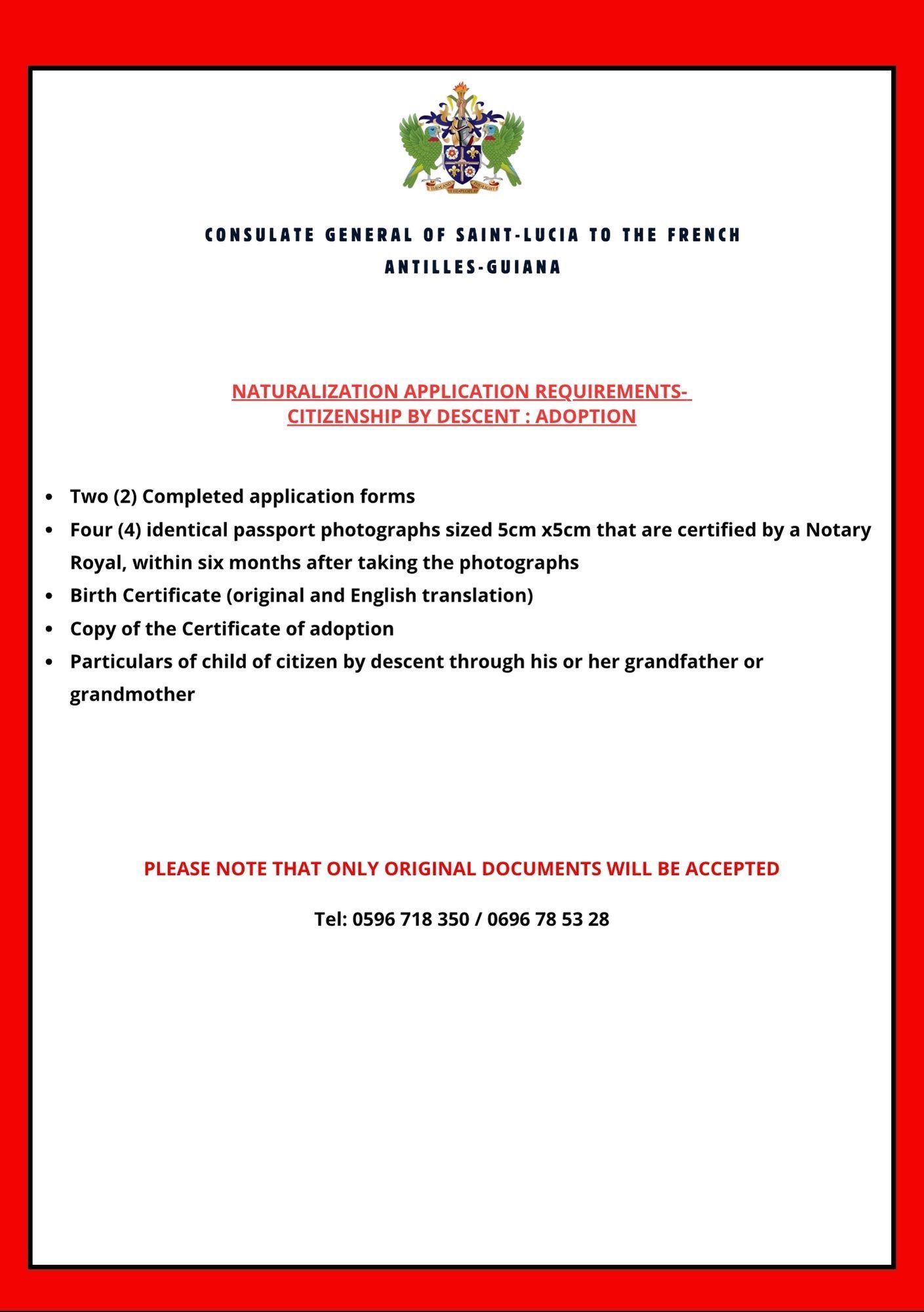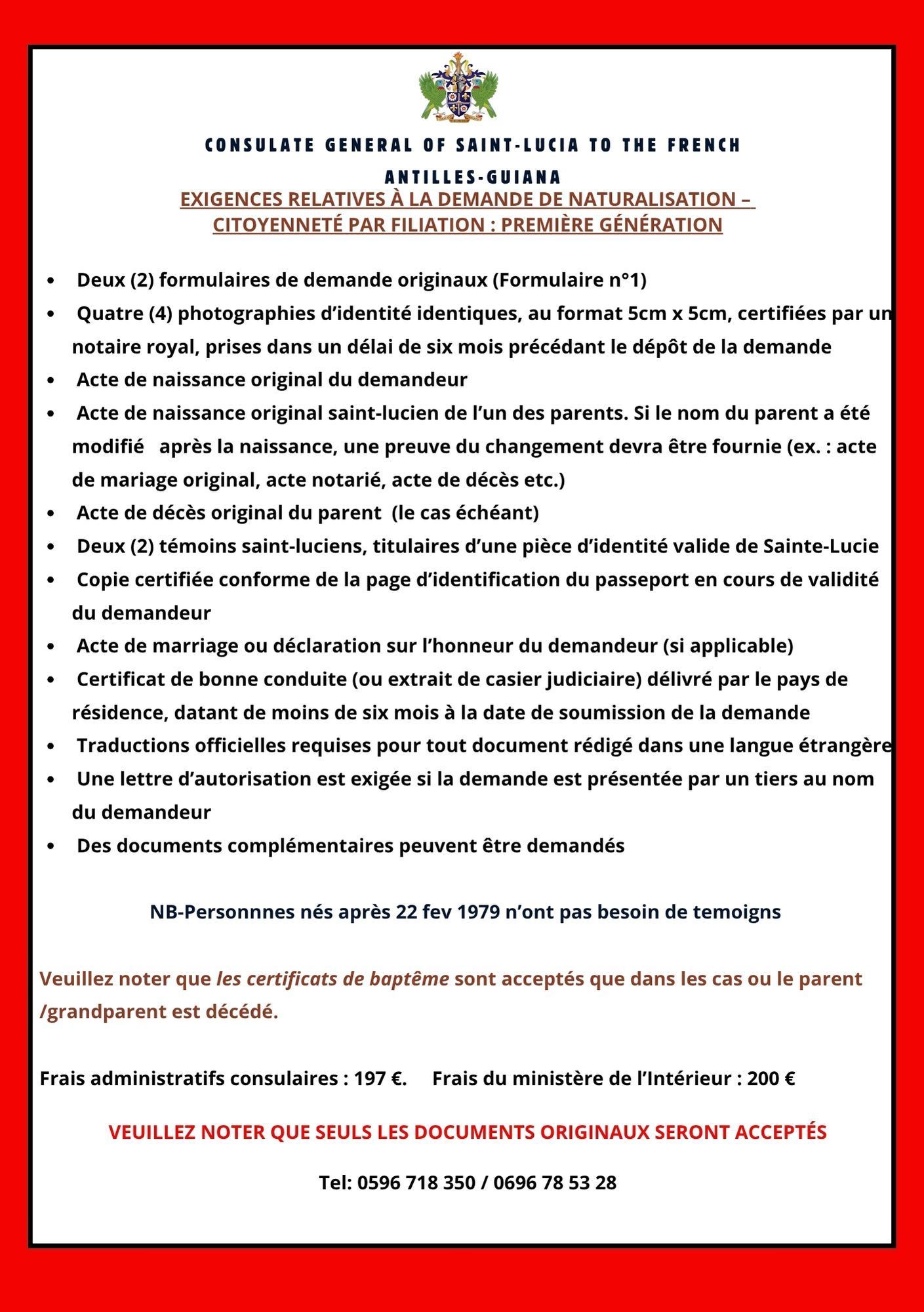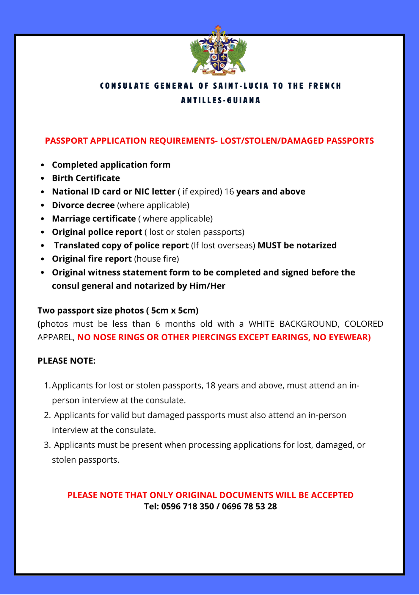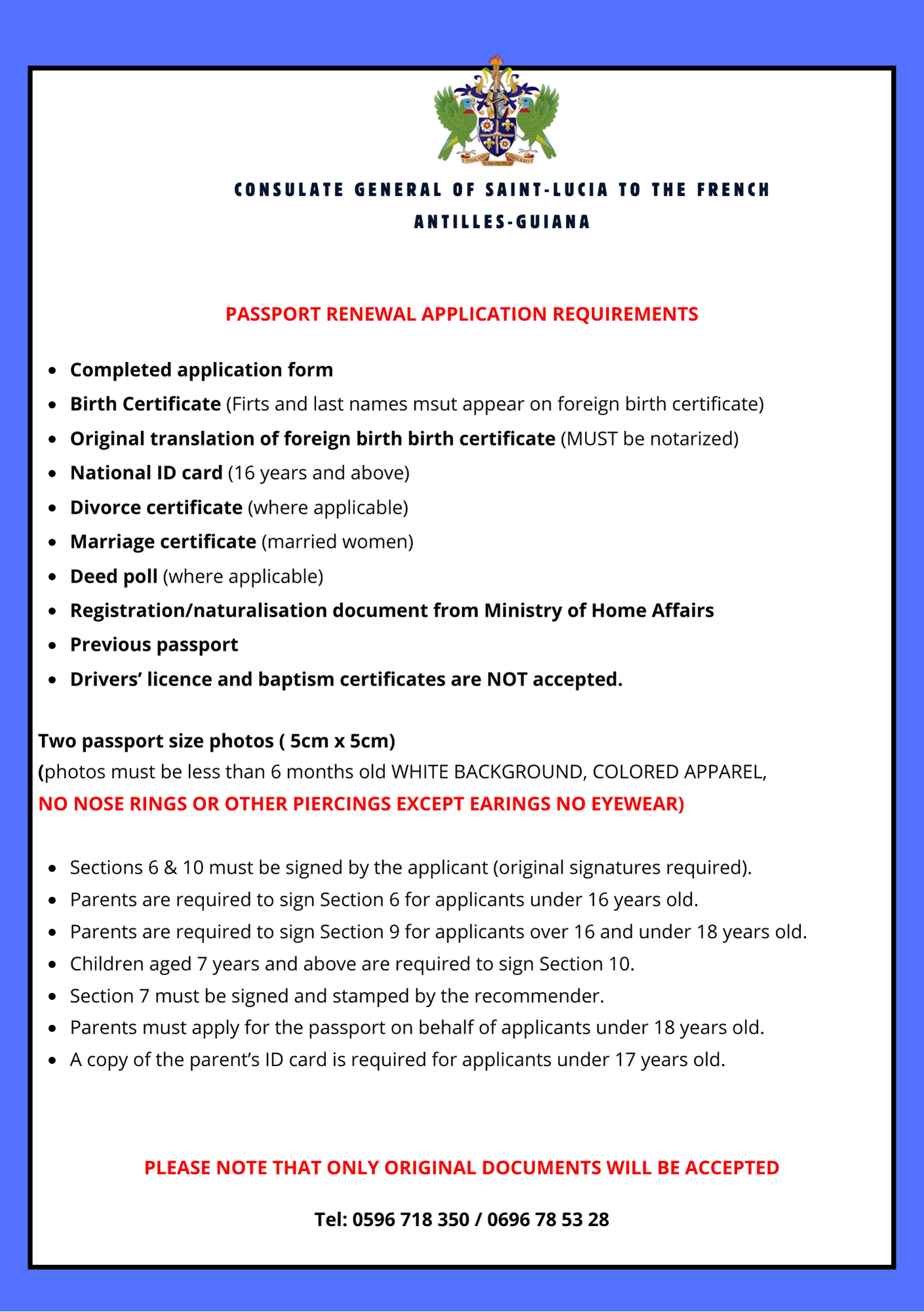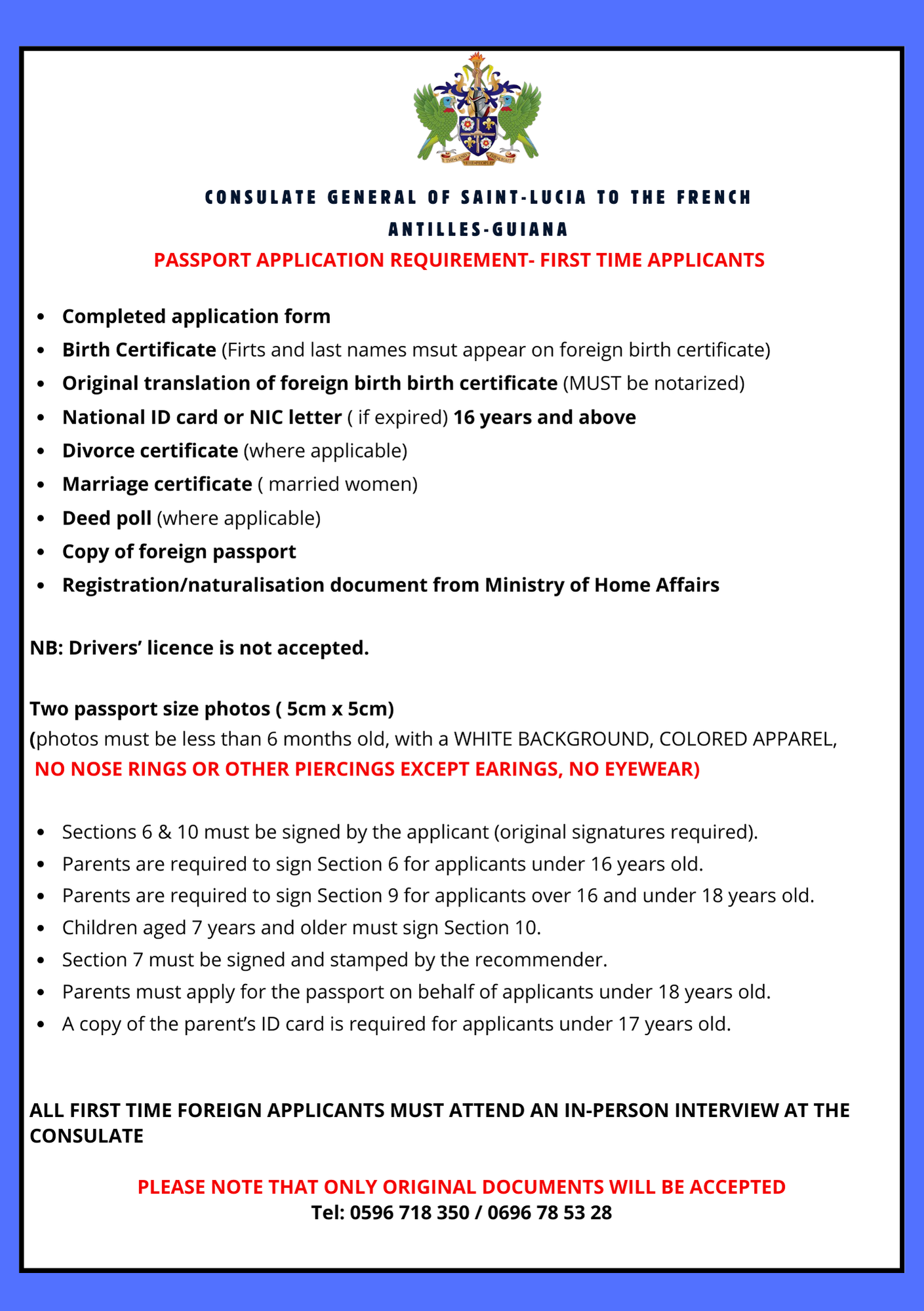 The Consulate General of Saint Lucia offers passport services for Saint Lucian nationals residing in Martinique, Guadeloupe, and French Guiana. Applications must be submitted in person by appointment only. All documents must be presented in original form and must be in English or officially translated into English.
