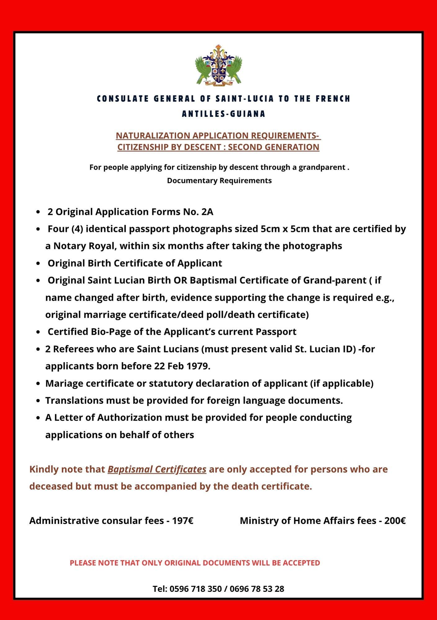 The Consulate General of Saint Lucia facilitates the application of births, death and marriage certificates of Saint Lucian nationals that occur in Martinique, Guadeloupe, or French Guiana. These registrations are transmitted to the Civil Status Registry on their behalf. The requests require a minimum of 6 weeks for processing.