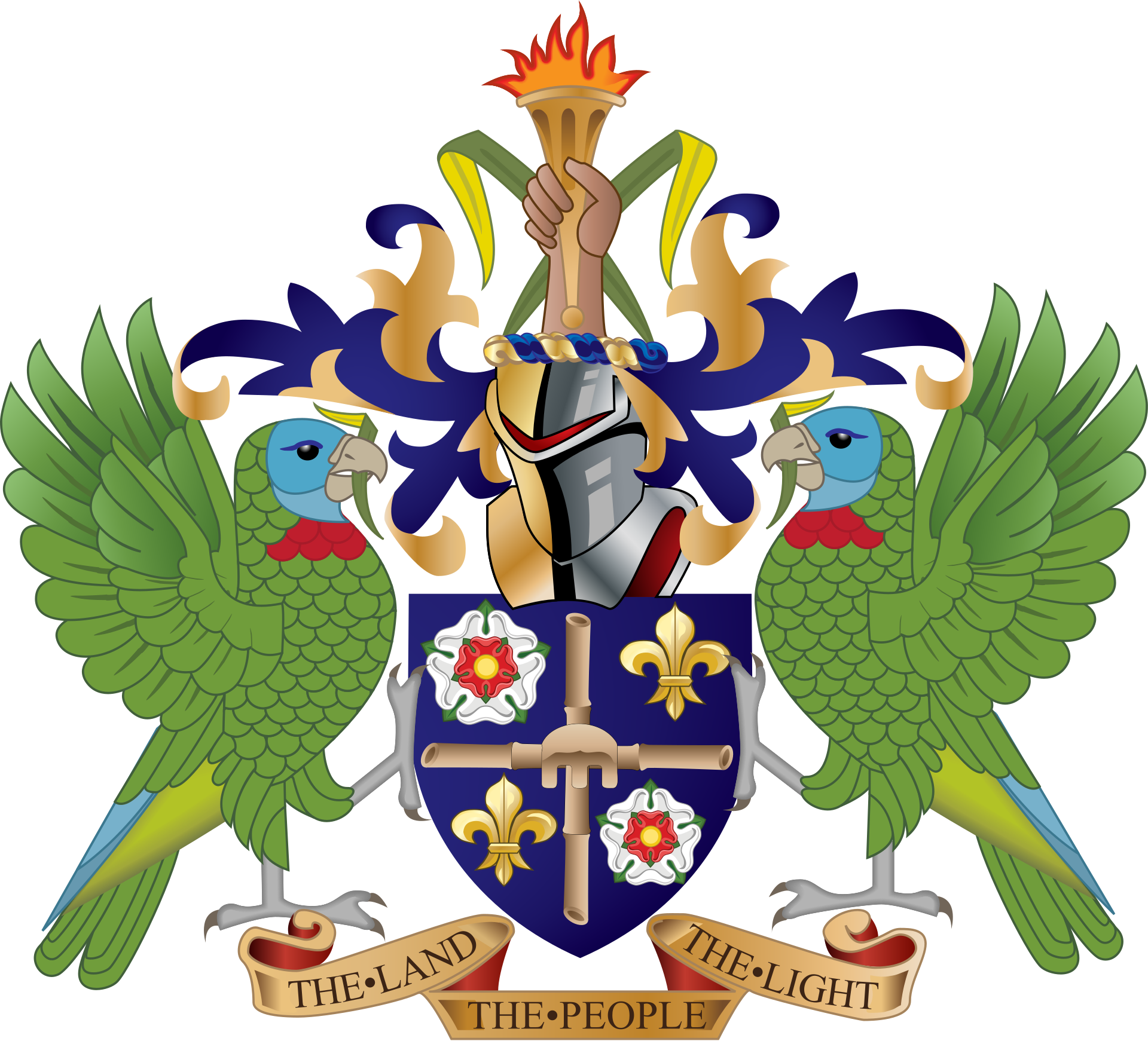The coat of arms of Saint Lucia was designed by Sydney Bagshaw in 1967. The coat of arms is made of a blue shield with a stool, two roses and two fleur de lis. The shield is supported by two Saint Lucian parrots. Beneath the shield is the national motto, where as above the shield there is a torch and on ornament. The symbolism of the elements are: