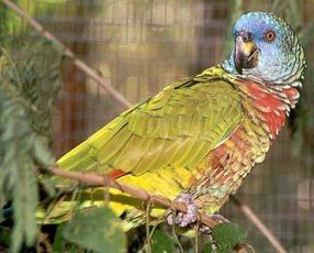 It was first described by Miller in 1776, this beautiful parrot is, and always has been found only in Saint Lucia. It is predominantly green in colour, and a typical specimen has a cobalt blue forehead merging through turquoise to green on the cheeks and a scarlet breast.