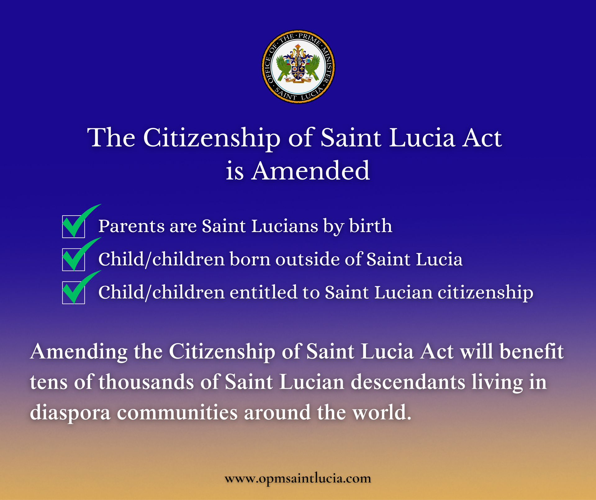 This progressive development enables more Saint Lucian descendants, particularly those living in the diaspora for two generations to formally reconnect with Saint Lucia through citizenship.